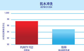 - 与许多竞争对手的食品级润滑脂相比,PURITY FG 润滑脂具有更好的抗水冲淋性、抗水喷雾和抗大多数清洁用消毒剂,从而减少了重新涂脂所需的停机时间